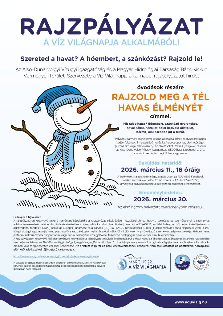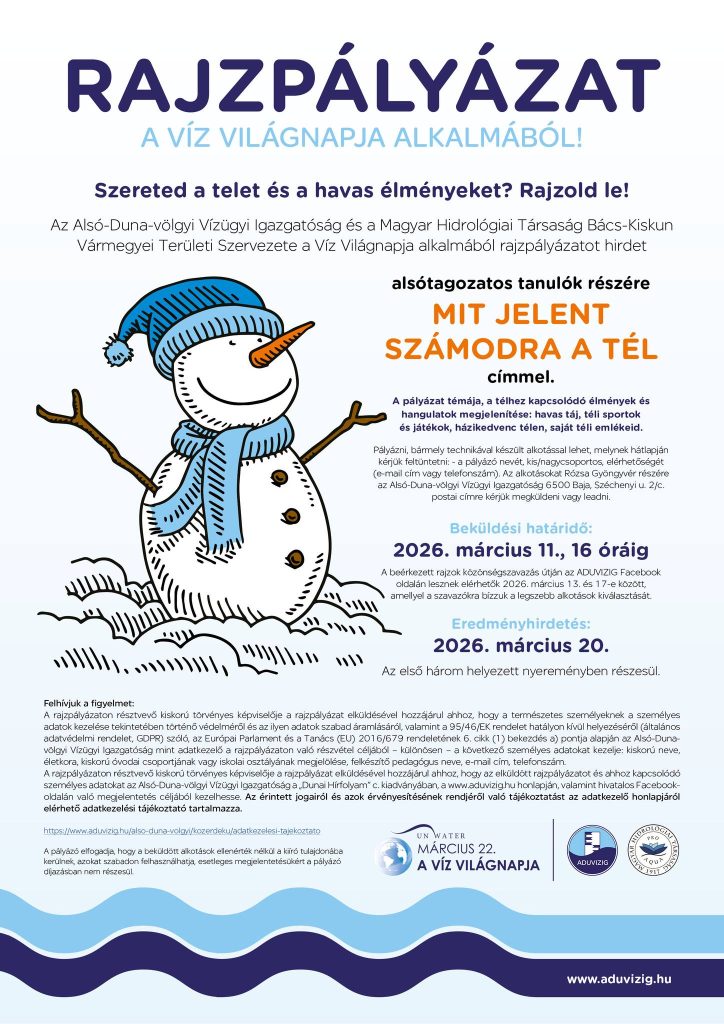 A rajzpályázaton résztvevő kiskorú törvényes képviselője a rajzpályázat elküldésével hozzájárul ahhoz, hogy a természetes személyeknek a személyes adatok kezelése tekintetében történő védelméről és az ilyen adatok szabad áramlásáról, valamint a 95/46/EK rendelet hatályon kívül helyezéséről (általános adatvédelmi rendelet, GDPR) szóló, az Európai Parlament és a Tanács (EU) 2016/679 rendeletének 6. cikk (1) bekezdés a) pontja alapján az Alsó-Duna-völgyi Vízügyi Igazgatóság mint adatkezelő a rajzpályázaton való részvétel céljából – különösen – a következő személyes adatokat kezelje: kiskorú neve, életkora, kiskorú óvodai csoportjának vagy iskolai osztályának megjelölése, felkészítő pedagógus neve, e-mail cím, telefonszám.