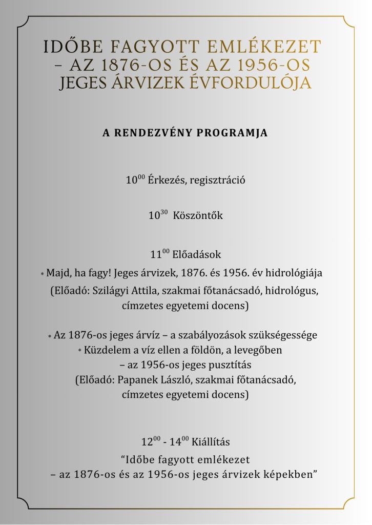 Az idei megemlékezés középpontjában az 1876-os és az 1956-os jeges árvizek állnak: a 150., illetve a 70. évfordulóra emlékezünk. A rendezvény célja, hogy közösen idézzük fel e jelentős történelmi eseményeket, és méltó módon emlékezzünk mindazokra, akik részesei voltak ezeknek a sorsfordító időszakoknak.